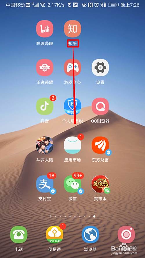1打开手机进入后,点击 知乎 。由于色彩或者亮度的原因,可能不容易找不到,请多一些耐心。