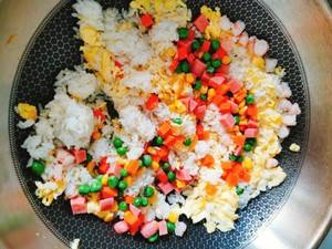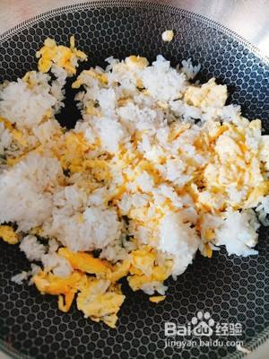 鸡蛋未完全凝固时倒入米饭,快速翻炒均匀