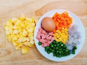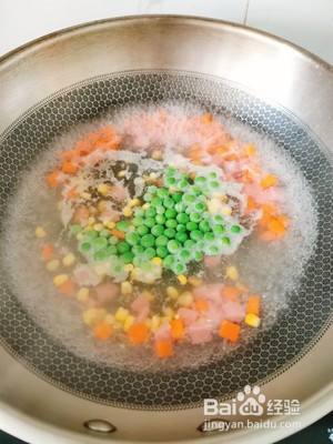 锅中加入适量的水,水开以后将青豆,胡萝卜,虾仁,火腿下入锅中焯水煮熟,捞出控水