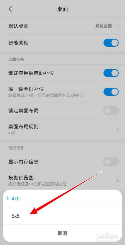 在桌面页面,点选桌面布局规则右侧箭头,在规则窗口,点选5x6即可设置桌面图标排布方式;