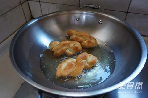 10锅中热油,待油升高把麻花放入炸至麻花浮起翻动,表面金黄色