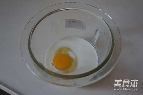 1牛奶、鸡蛋、白糖、食盐加入碗里
