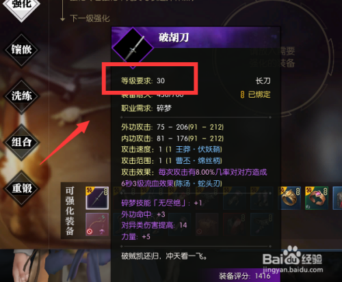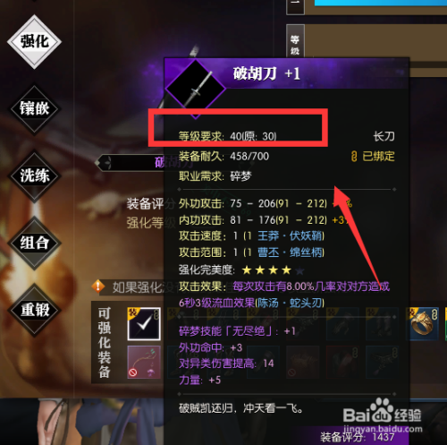 如图,强化后紫武确实升到了40级,但这里的升级仅仅是提升了佩戴等级,其实武器还是30级没有变。