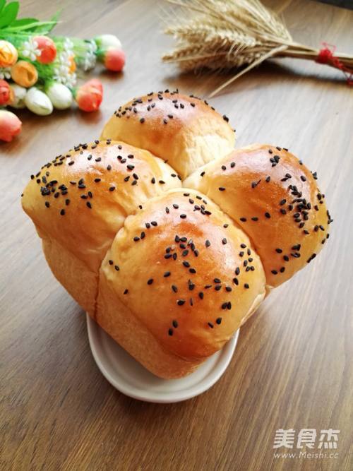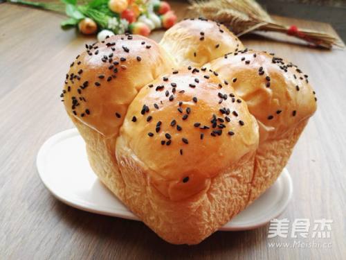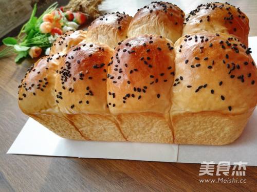 12烤箱预热上火165度,下火170度,预热完成后,将面包坯放入烤箱,烤制33分钟,表面金黄色,用手按压面包的侧面,能很快的回弹即表明成熟,取出面包晾凉即可