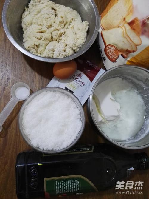 3主面团的原料:中种面团(已经发酵完成)、面包粉、鸡蛋、奶粉、盐、白糖、酸奶、橄榄油