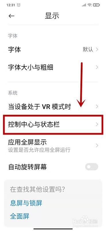 进入【显示】页面后,上滑屏幕,找到并单击【控制中心与状态栏】