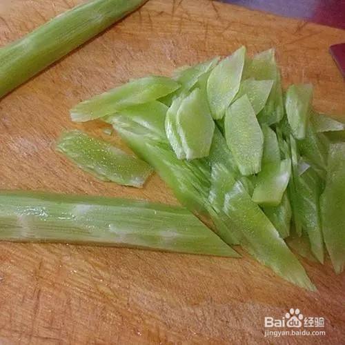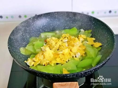 锅内放入少许油,放入葱花炒香,放入莴笋煸炒2分钟,倒入炒好的鹅蛋翻炒。