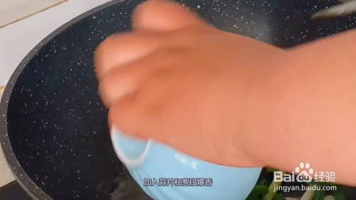鸡蛋炒熟后,盛出备用,在锅中热油,加入蒜片和葱段爆香。
