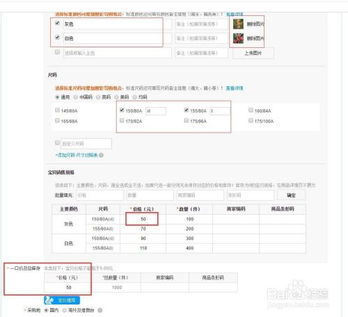 设置颜色或者尺码等销售属性。颜色尺码里面的价格可以设置不同的价格。比如50--110。一口价要设置最低价格50元。50元显示如图