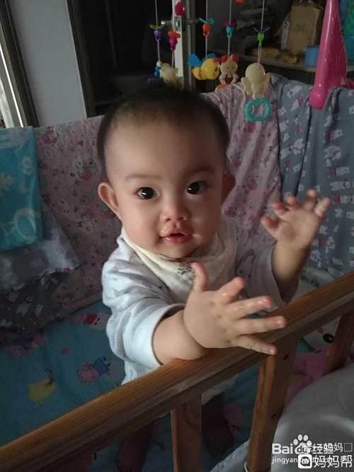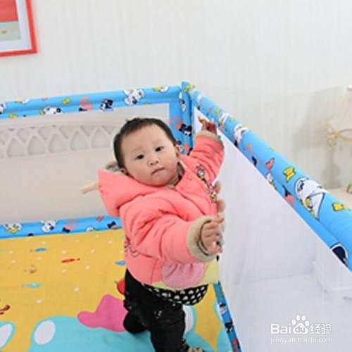 测试方法:在床栏上挂玩具,鼓励宝宝站起来