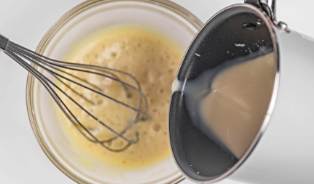将温度降至60°左右的红茶奶液缓慢倒入蛋黄液中,不停搅拌。
