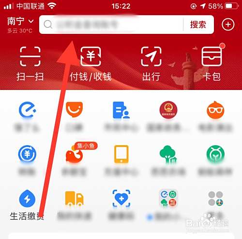 打开手机上边的【支付宝】进入软件后,点击顶上的【搜索框】。