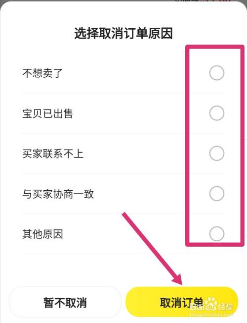 最后勾选一个取消订单的原因,点击右下角的【取消订单】即可,钱款会退还给买家原账户。