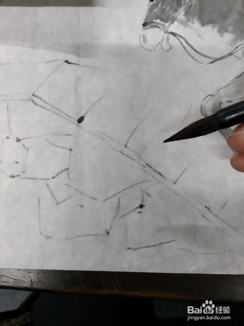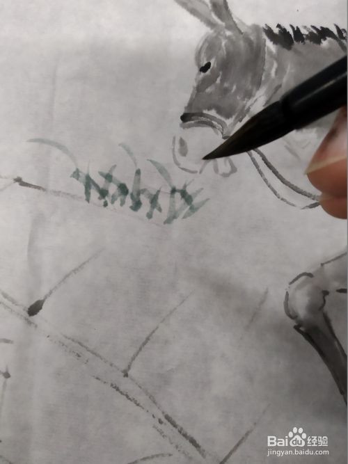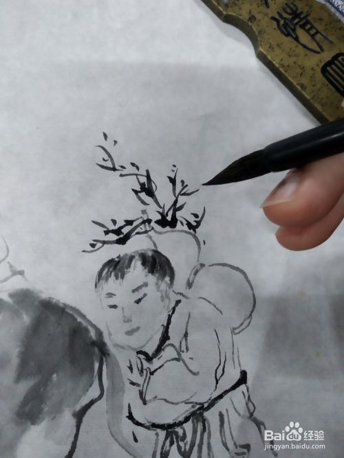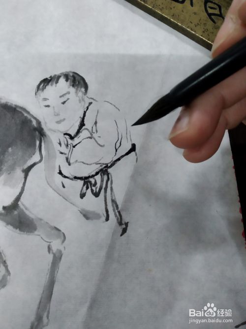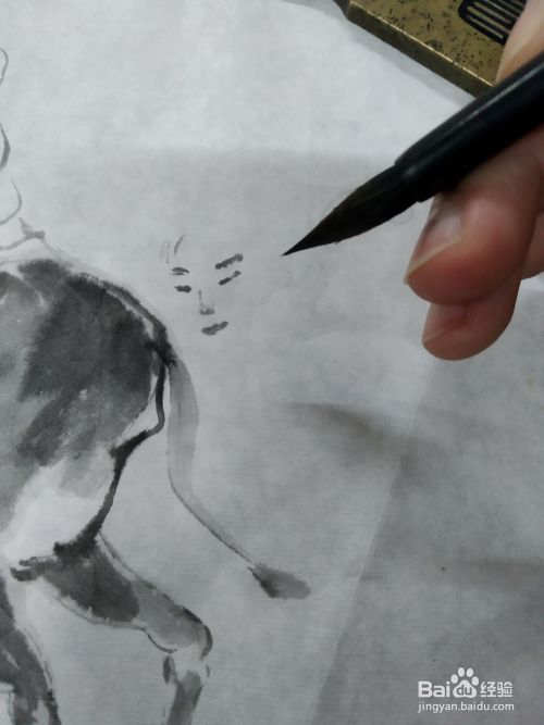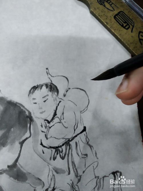 我们接着上一期的骑驴人物,在它的旁边画一个童子,首先用淡墨画出人物的五官,因为是孩子,所以他的五官比较集中,