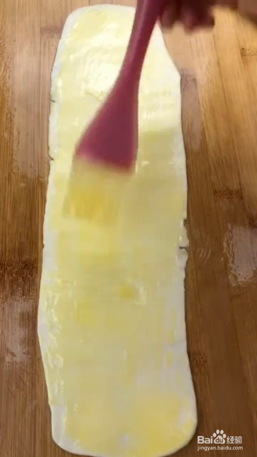将油酥调好,醒发的面团分成几个小剂子,擀成长面片,刷上调好的油酥