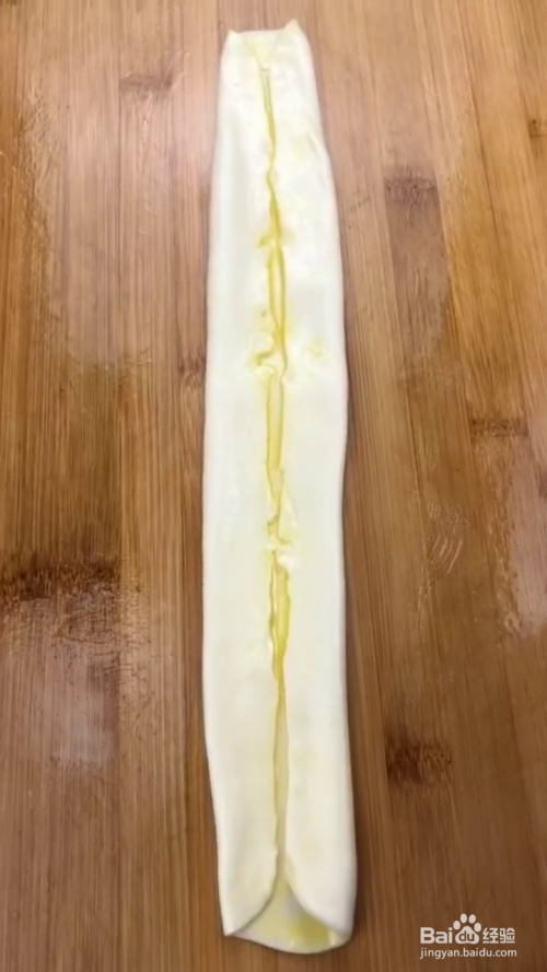 两长边向中间对折,再对折,再将折叠出来的长条卷起来擀平
