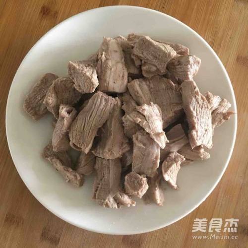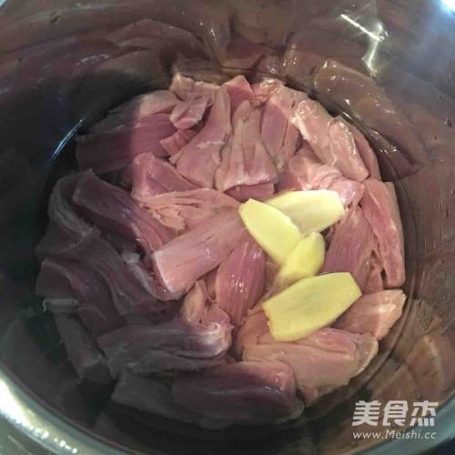 里脊肉洗净,顺肉丝纹路切成长条状,加姜片、水入高压锅压熟