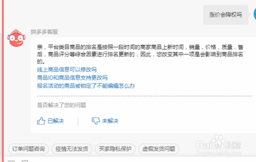 在和客服对话框中,输入自己想要咨询的问题。我们输入涨价会降权吗