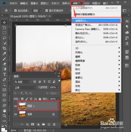 接下来,我们选中拷贝的图层1,然后在【滤镜】中找到【滤镜库】。