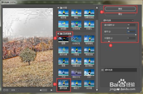 我们在艺术效果里面选择【塑料包装】,然后把高光强度设置为【15】,细节为【16】,平滑度为【3】,点击【确定】。