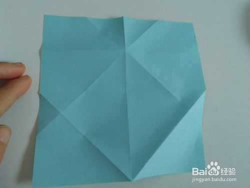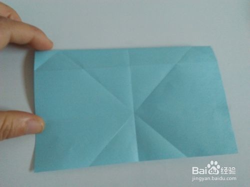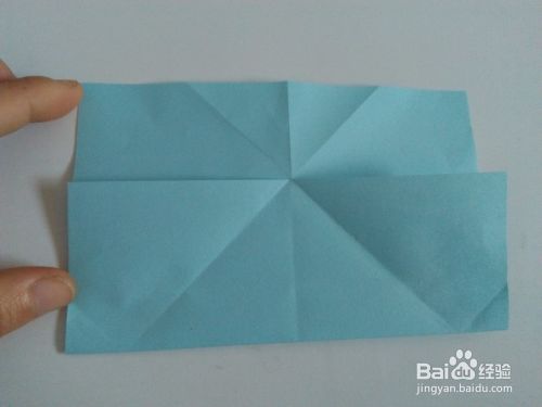我们先把彩纸的中线对折,再把上下两边向中线对折。然后把上侧的角向内折,打开后,再把下侧的角向内折。