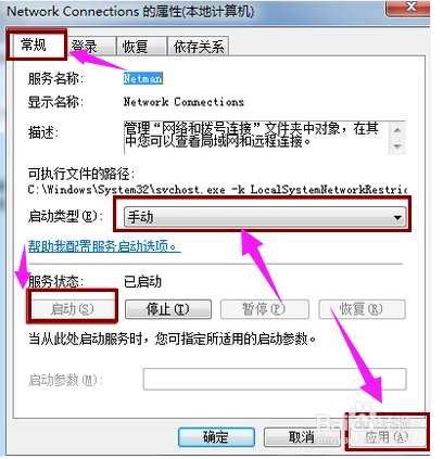 第六步,在Netword Connections属性窗口,选择“常规”选项卡,将“启动类型”中的“已禁用”改为“自动”,