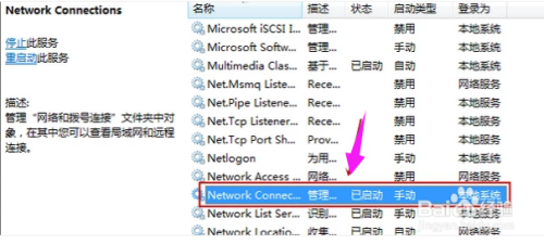 第五步,进入服务窗口后,在列表窗口中,找到Netword Connections这一爬霜项,双击进入