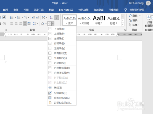 点击标题栏中【边框】右边的小三角,选择【边框和底纹】弹出窗口;