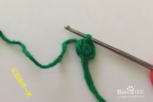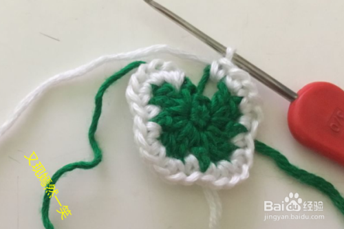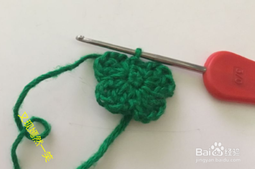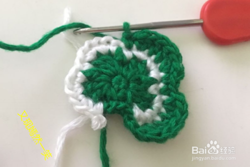 然后都是参照上述的方法,将余下的2片叶子钩织完毕。然后在第四圈的第一个短针钩织引拔针连接。