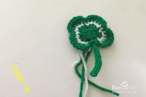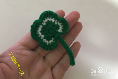然后再拉15个辫子针,返回在倒数第3针开始顺次做引拔针连接。再在第四圈的引拔针处做引拔针连接,然后抽线断线,将线头藏好,完成幸运草的钩织了。