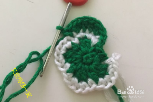 第四圈:换绿色的线进行钩织,钩针在第三圈的第一个短针处钩织1个短针,拉、再拉1个辫子针,然后再在下一个短针上钩织1个中长针,1个长针,在下一个短针上钩织1个长针,再在下一个短针上钩织1·个长针,再在下一个短针上钩织1个长针,1个中长针,拉1个辫子针,再在下一个短针上钩织1个短针,这样就是第一片叶子的钩织。