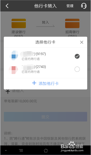 点下付款卡,进到选择他行卡窗口选择付款卡或添加付款卡,如图