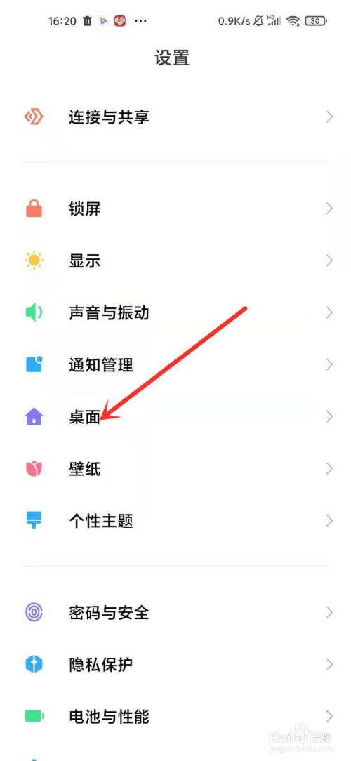 在设置界面中点击【桌面】选项,进入桌面界面。