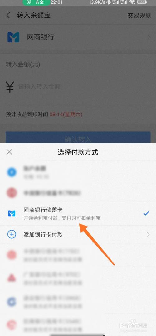 在余额宝转入资金时,选择网商银行的付款方式,将网商银行转到余额宝中。