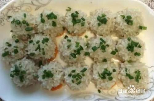 蒸好的珍珠丸子用葱花点缀一下就可以享用了。