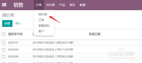 找到销售菜单并点击,进入销售面板,点击订单按钮,在弹出来的下拉选项中选择报价单。