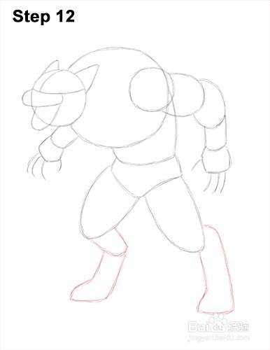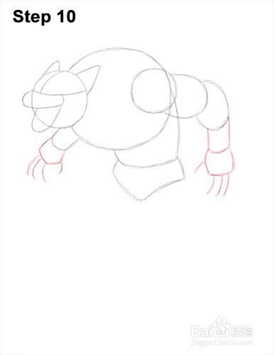 第10步:在以前的形状下绘制手指的指南。使用两条短的垂直线和底部的曲线画出前臂的底部。在这之下,请画出狼人的手指作为一种圆形。在底部画三条曲线,左边画一条较短的线。首先绘制成角度的弧状形状,然后在左侧添加手。然后为手指和拇指添加短而曲线。