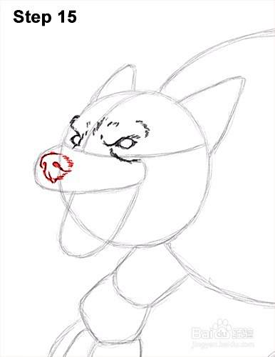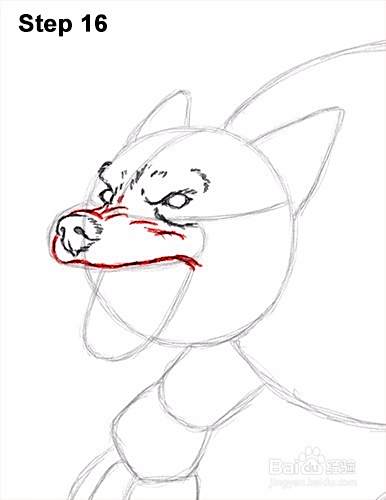 第15步:先将狼人的鼻子画在枪口内,先轻轻勾画一个尖尖的小椭圆形底部。当你的鼻子的形状和位置正确时,将线条变暗。在鼻子里面,画两个小圆圈并将它们遮住鼻孔。使鼻子底部尖锐,以便它几乎接触到枪口的指导。在鼻子底部添加一条较短的垂直线,以获得额外的细节。