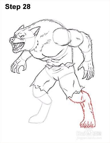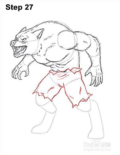 第27步:使用躯干下的形状作为导游,画出狼人破烂的裤子。沿导轨的顶部边缘绘制一系列斜线。然后使U形线的两侧变暗以创建大腿。现在在底部添加更多波浪形和斜线,以便看起来破烂不堪。使用右侧的U形线作为引导,以与第一条相同的方式绘制另一条腿。给你的狼人裤子表明它最近改变了。