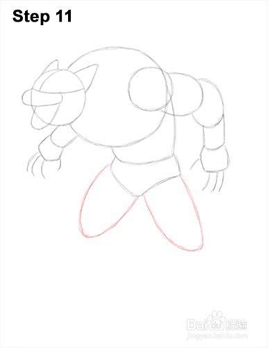 第十一步:在躯干下方,画两条长长的U形线作为狼人腿部的指南。首先做一个标记以指示弧线的长度,然后在两侧添加曲线。由于身体如何转向,右侧的指导应该更大。