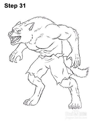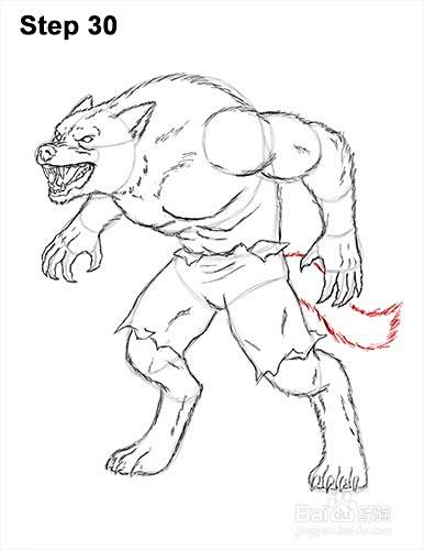 第30步:在身体的右侧,为尾巴绘制一个长长的弯曲形状。你可以尽可能长或短的尾巴。你也可以完全放弃它。在绘制狼人的尾巴时,务必不要重叠组成手的线条。