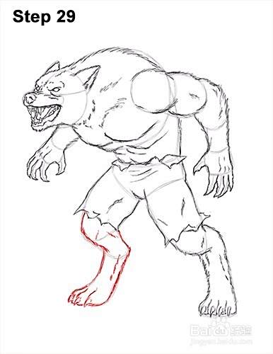 第二十六步:使用头下的形状作为导向来画另一只手。首先将顶部导轨的外边缘变暗以创建手腕。现在围绕最初的弯曲引导线绘制每根手指。沿着导轨的曲率弯曲手指以创建关节。让每个手指的尖端指向狼人的爪子。拇指应该更小。小指几乎不明显,所以只画一小部分。