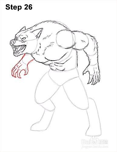 第二十二步:使用身体左上方的形状作为引导来绘制第一只手臂。使指南的外边变暗以创建手臂的形状。当你变暗的线条,使用快速,短的笔画毛茸茸的纹理。在里面加几条线,使手臂有一点肌肉的定义。如果你想让你的狼人的外套变得更加粗糙,那就用更长的笔触。