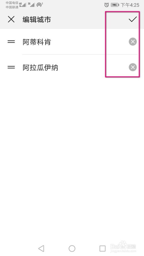 出现删除页面,点击想删除的城市右边的×按钮,然后点击√进行确定。