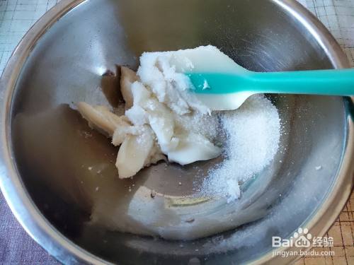 猪油加入糖,搅打至糖融化。如果有糖粉更好,更容易融化。如果猪油冻得太硬,可以连盆放热水中稍微软化一下。分两次加入35克全蛋液,搅打均匀。剩下的蛋液后面留着裹花生碎。