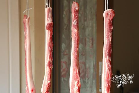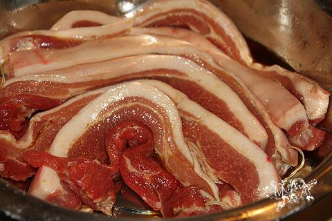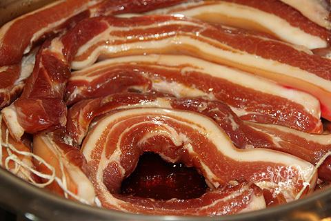 原方是先将肉在80度的水中,飞快过一下后再加盐腌制,以防止肉变质;我家大厨腌制时气温很低,所以跳过此步骤,担心肉变质的,可多做一步;但勿久烫,飞快过一下即可,否则肉就煮熟了。