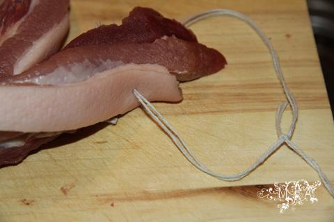 1制作过程:在肉上扎一个孔,穿上棉线。