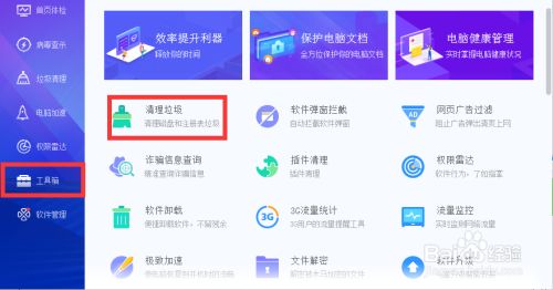 先打开电脑管家,点击【工具箱】,再点击【垃圾清理】。
