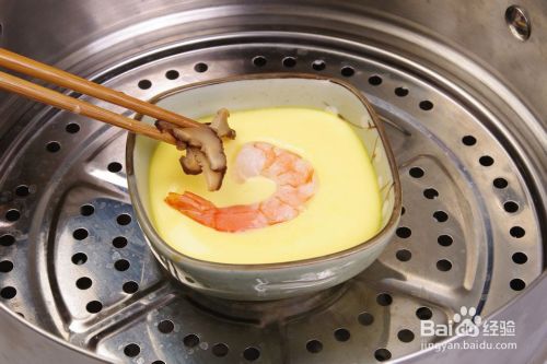 蒸至4分钟时,轻轻开盖,放入虾仁和香菇碎;蒸至7~8分钟,可以用筷子轻轻推动碗,蛋液轻颤不晃动就已经熟了;加入生抽,香葱碎后即可食用.