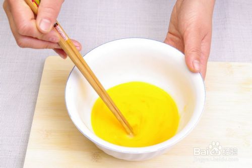 将鸡蛋打在碗中,用筷子或者打蛋器匀速搅匀,尽量不要打起泡沫